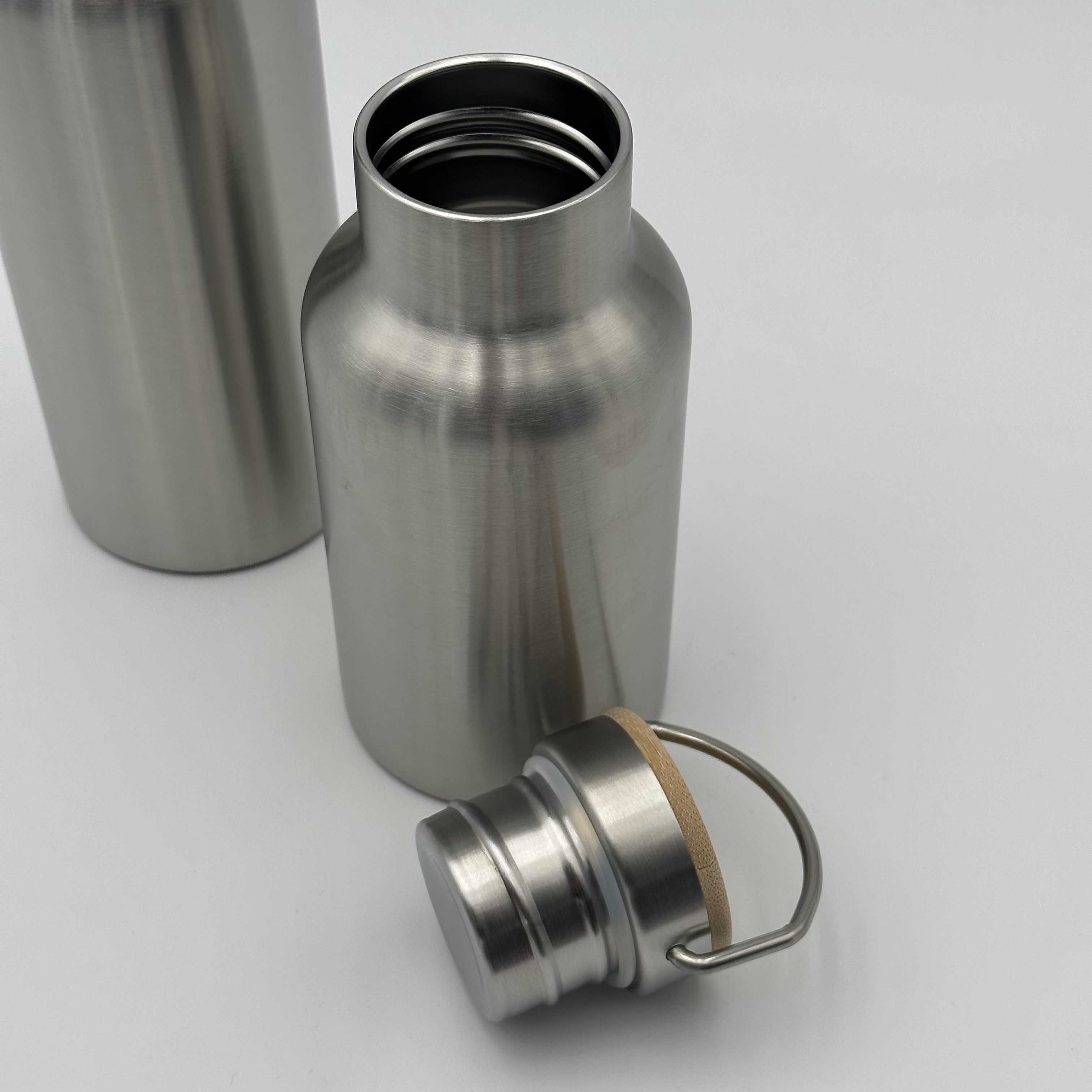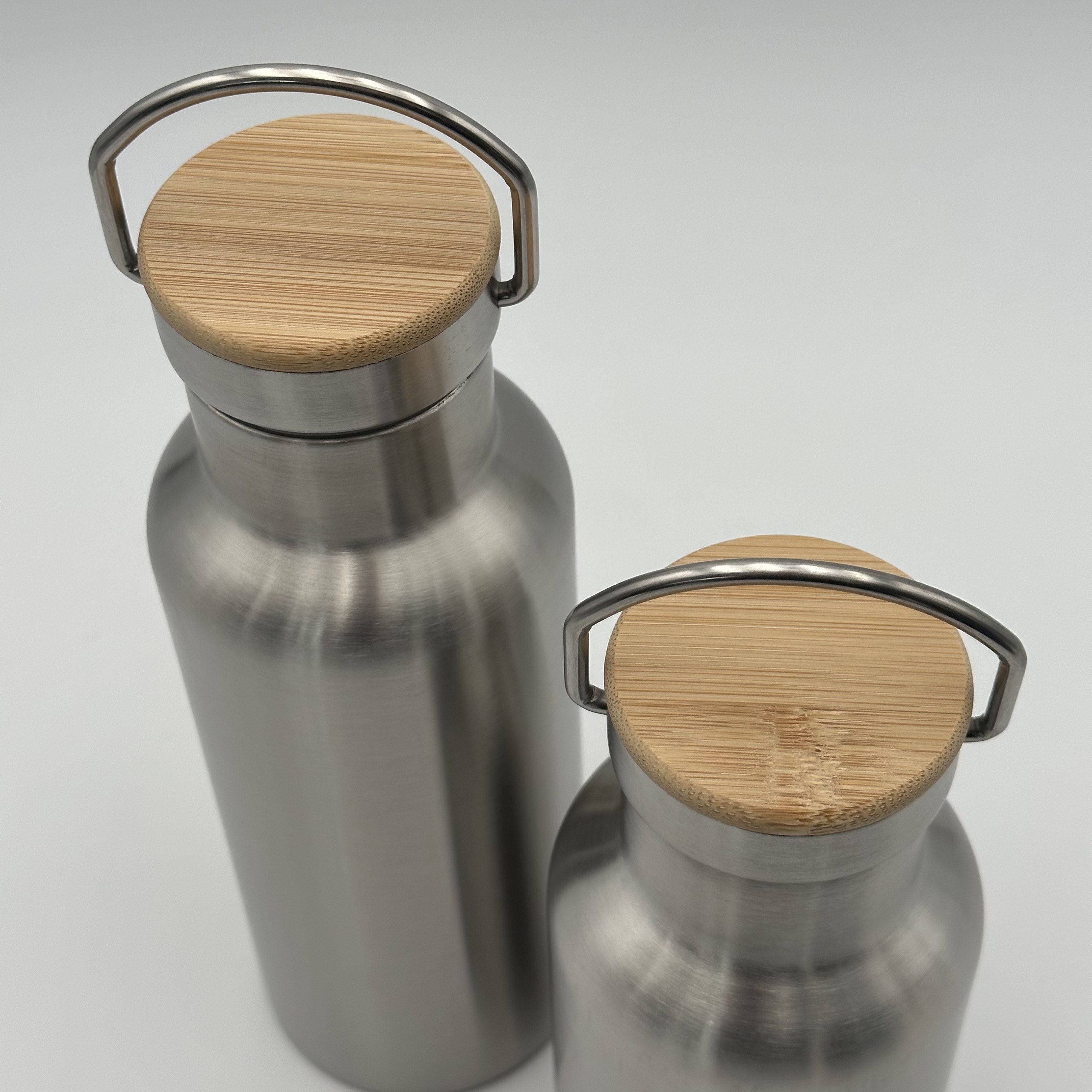 Diese edelstahl-farbene Thermo-Trinkflasche mit Bambus Verschluss, silikonring und Griff umfasst 500 ml und hält Heißes lange heiß und Kaltes lange kalt durch eine Doppelwandkonstruktion.