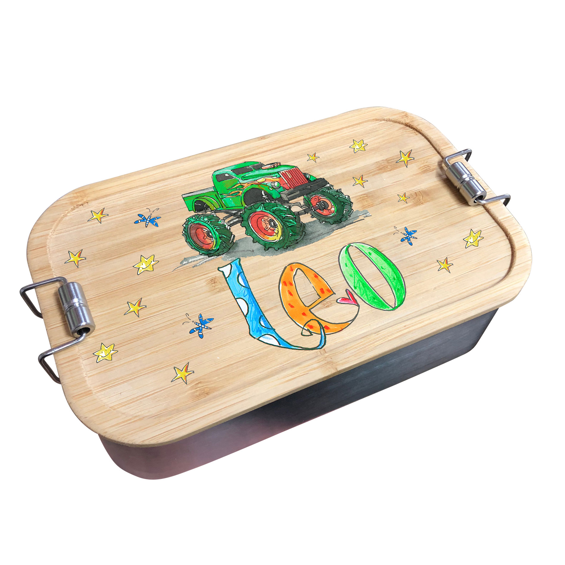 Edelstahl Brotdose Monstertruck, Bambusdeckel