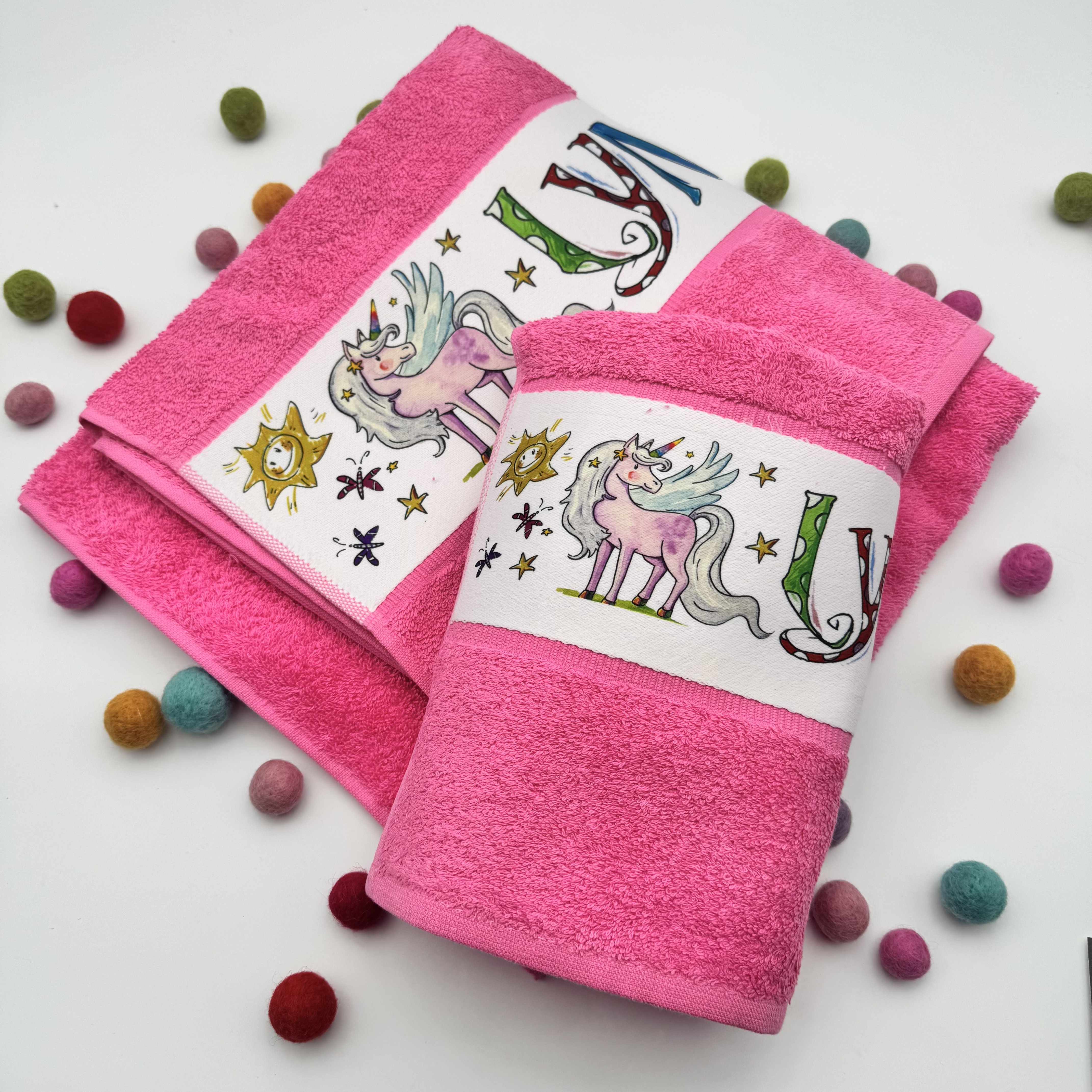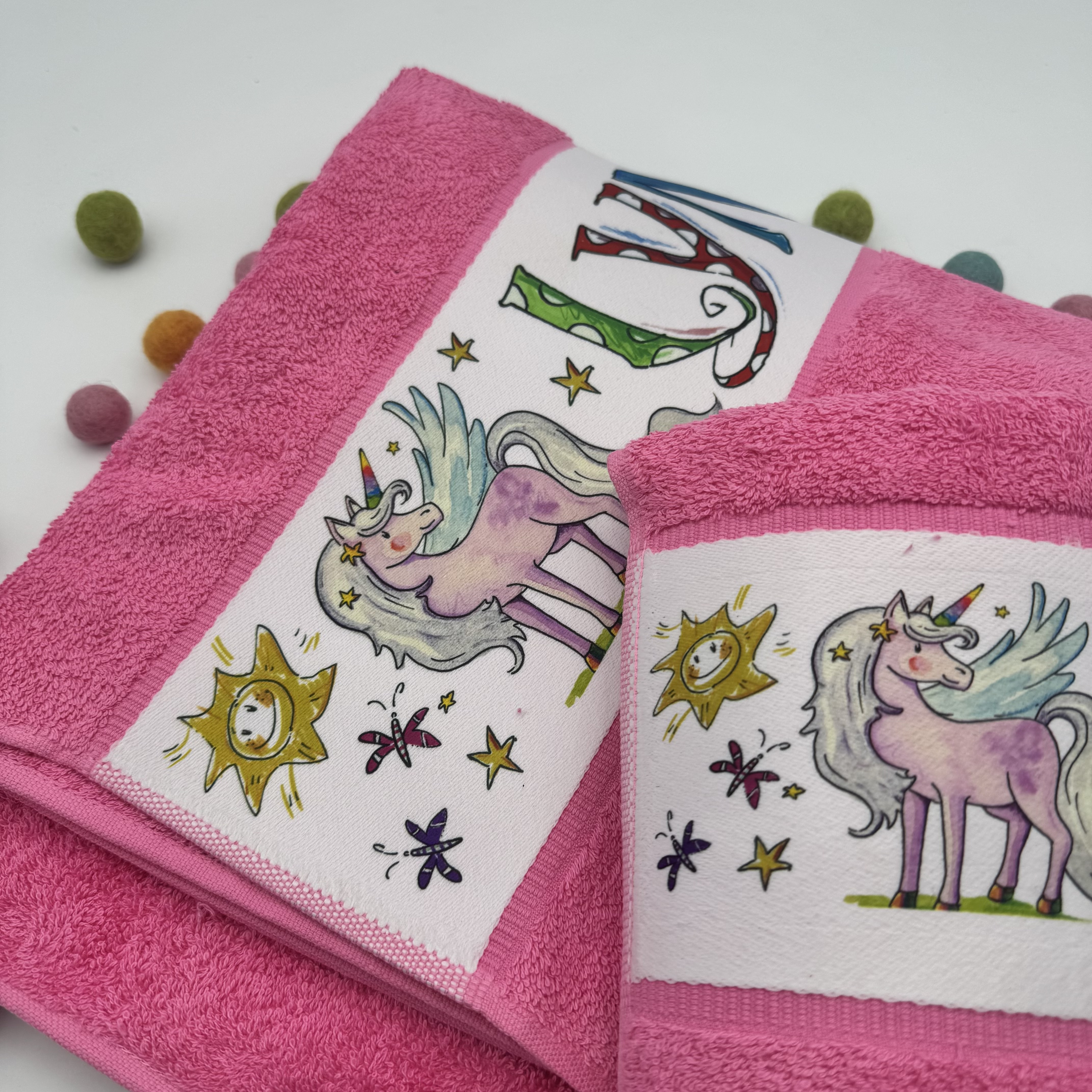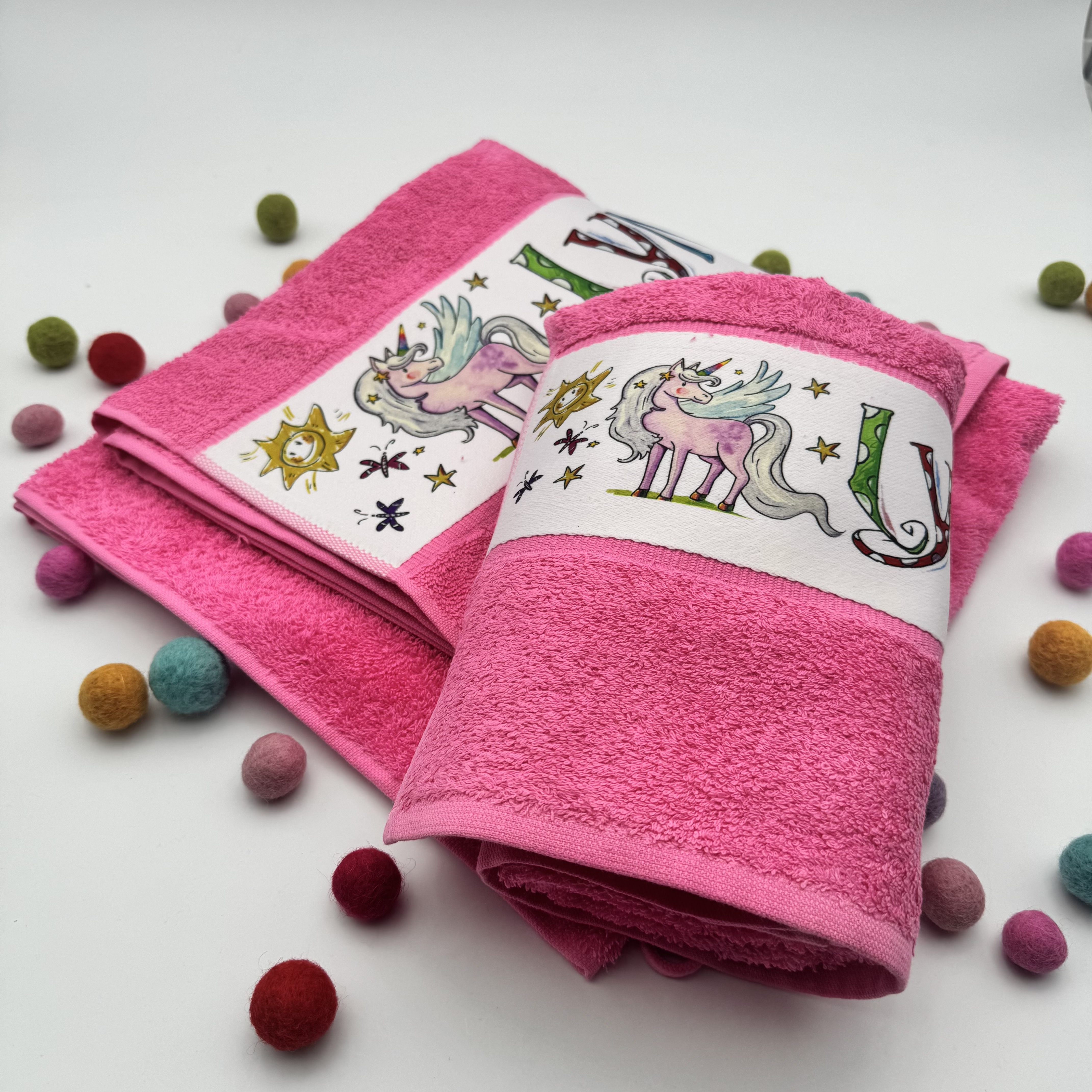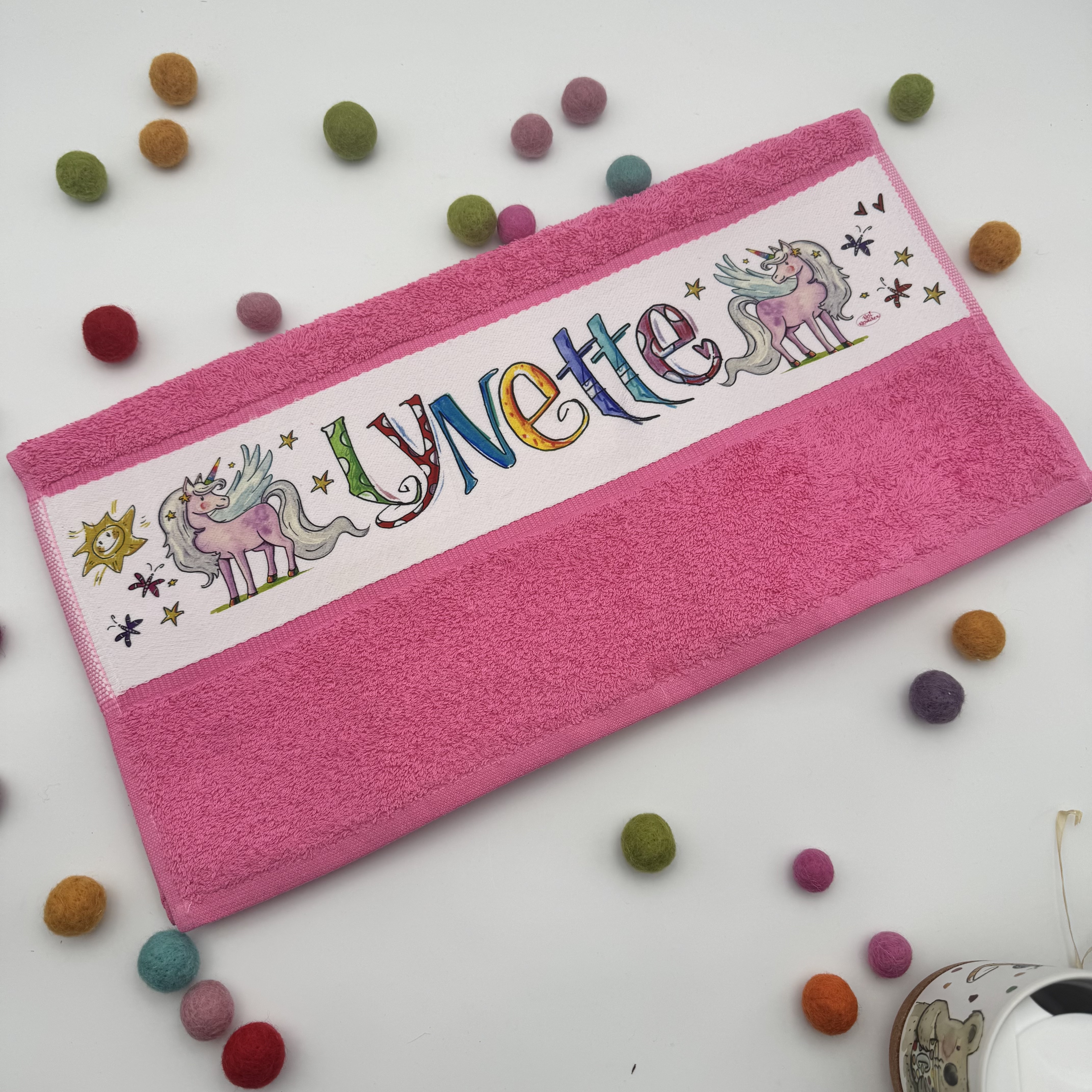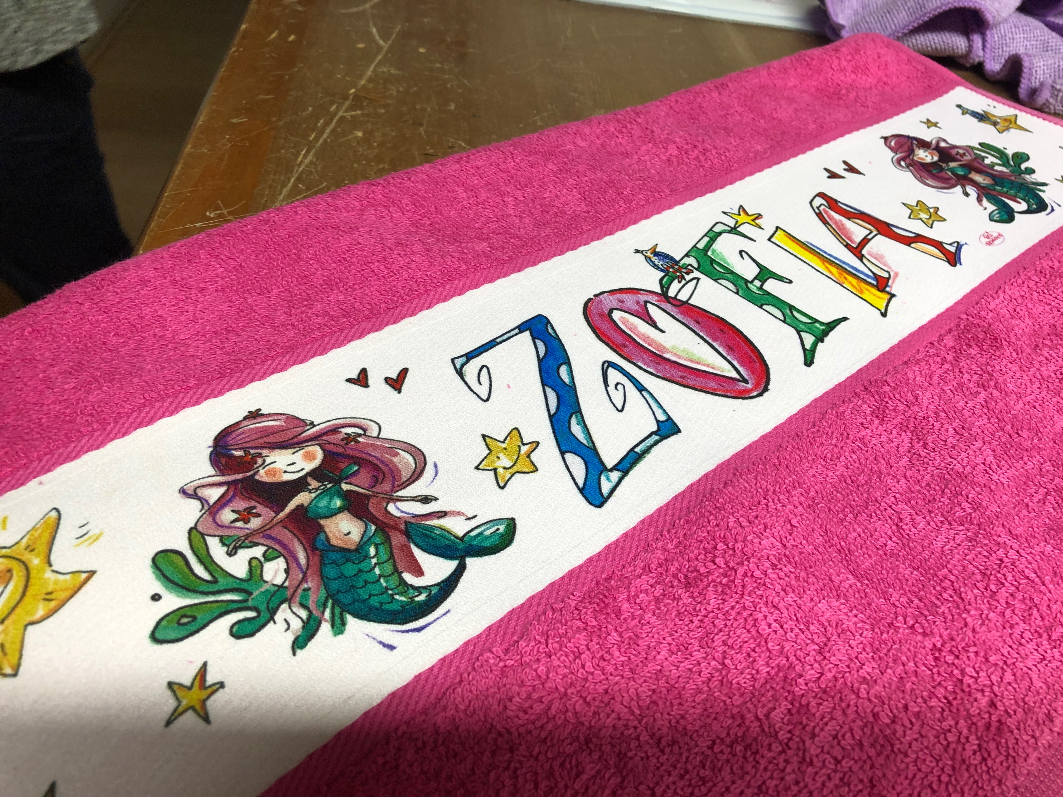 Das eigene farbige Handtuch bedruckt mit dem illustrierten Namen. (Preis bezieht sich nur auf das Handtuch, verschiedene Sets sind möglich)