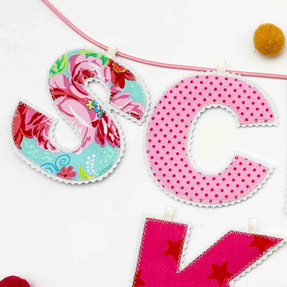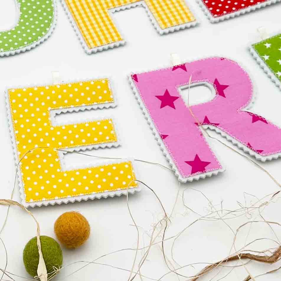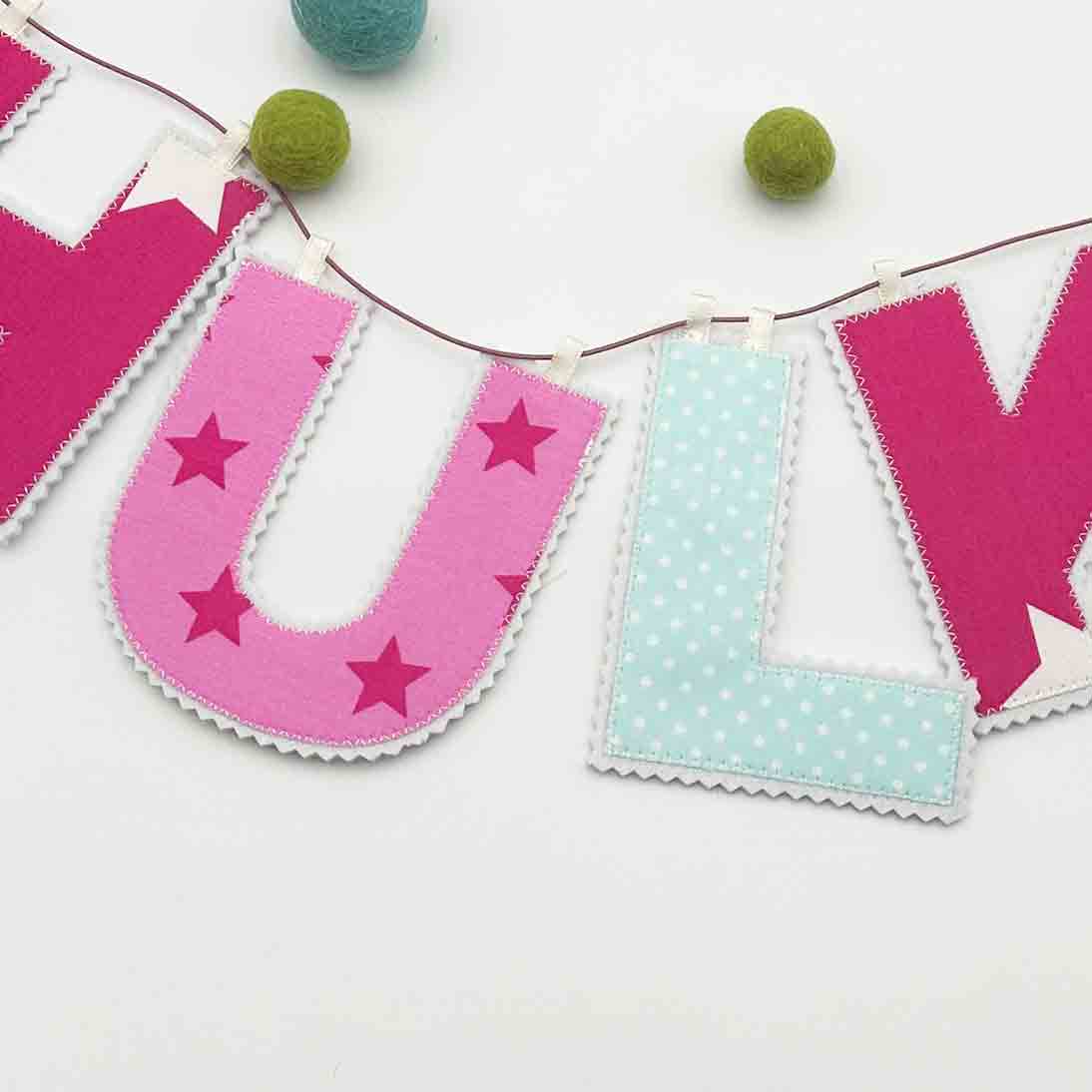 Namensgirlande, Stoff pink, rosa, gelb, grün