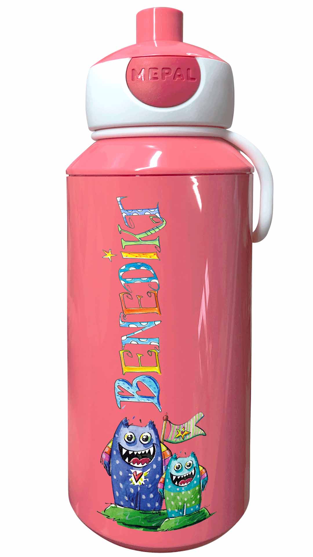 Durch die illustrierten Namen und den lustigen Motiven werden die Brotdosen mit Namen zu tollen handgemachten Unikaten. Die Trinkflasche Mepal Popup mit lustig bunten illustriertem Namen lässt sich öffnen den Knopf zu drücken und schließt lustigerweise dadurch den Trinkstutzen wieder reinzudrücken.