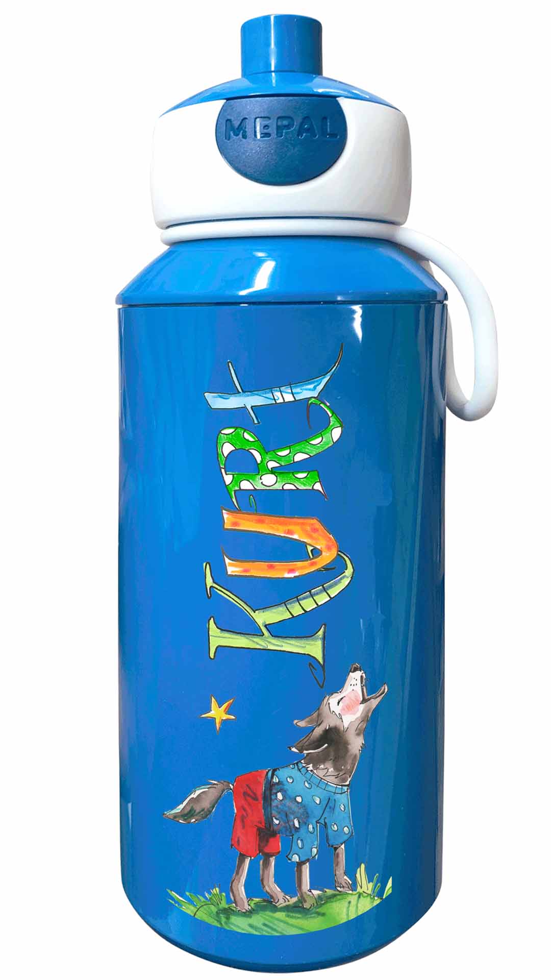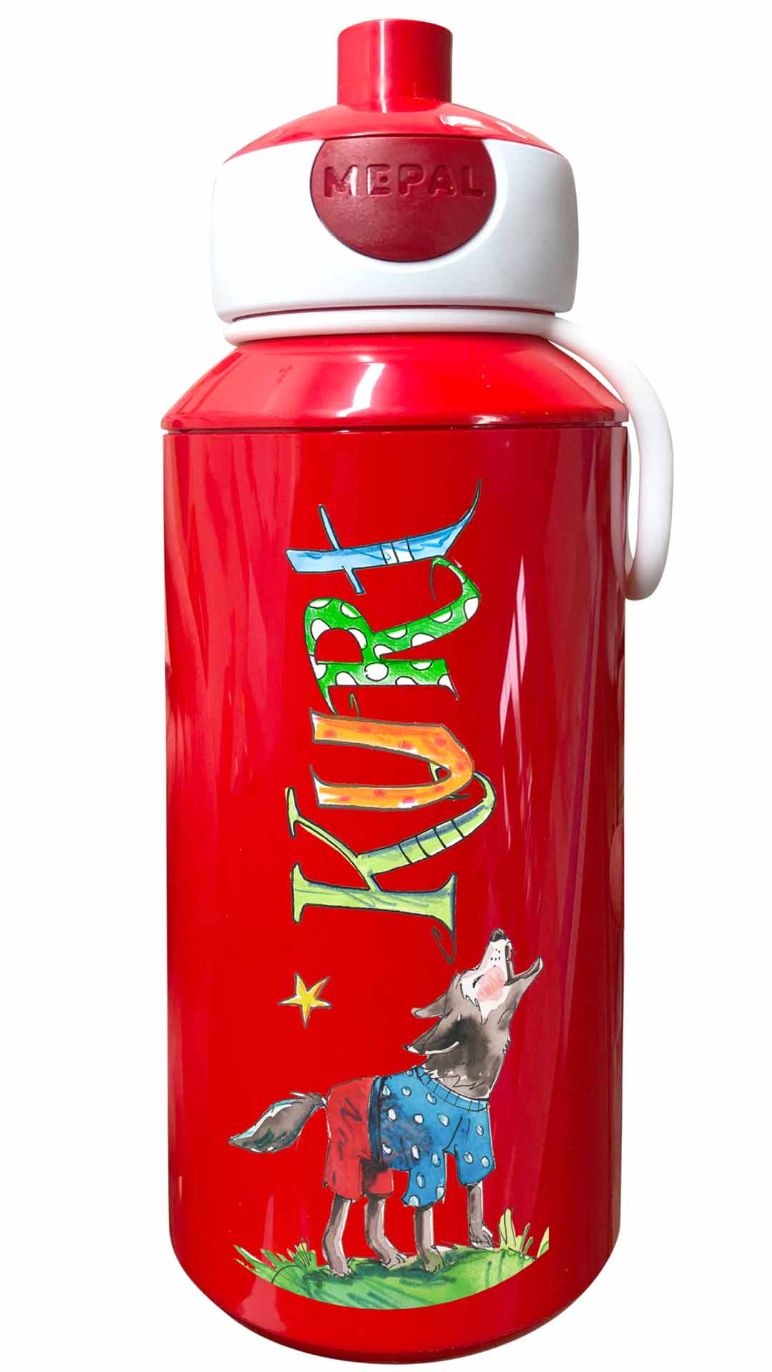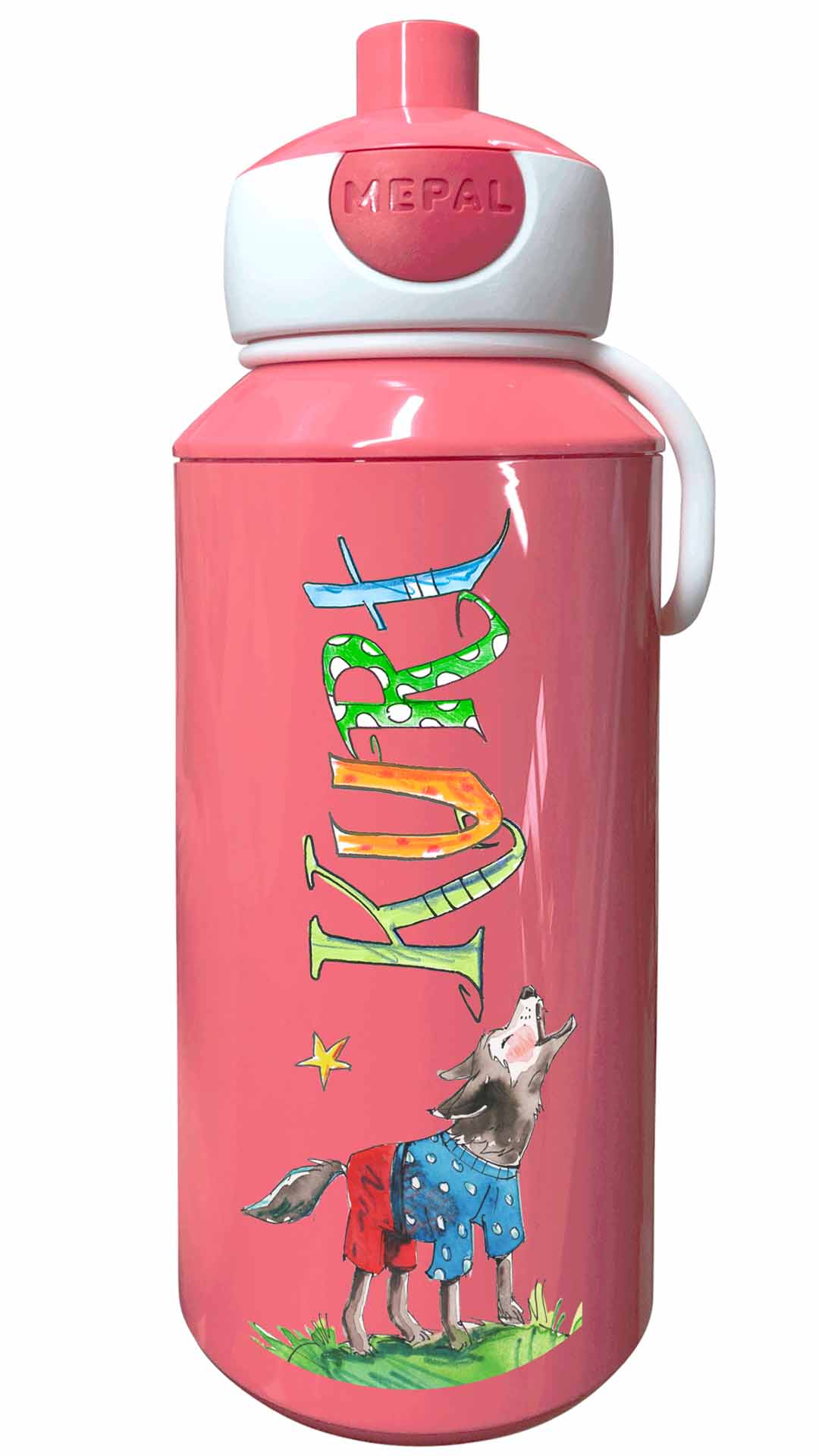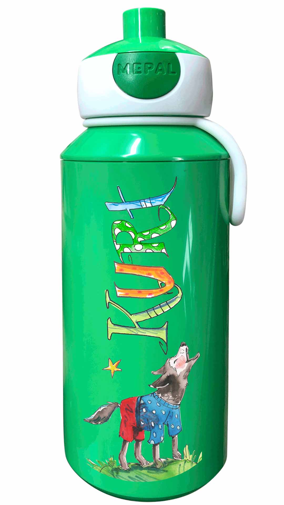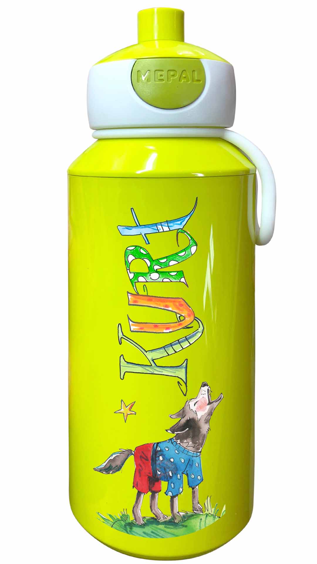 Durch die illustrierten Namen und den lustigen Motiven werden die Brotdosen mit Namen zu tollen handgemachten Unikaten. Die Trinkflasche Mepal Popup mit lustig bunten illustriertem Namen lässt sich öffnen den Knopf zu drücken und schließt lustigerweise dadurch den Trinkstutzen wieder reinzudrücken.